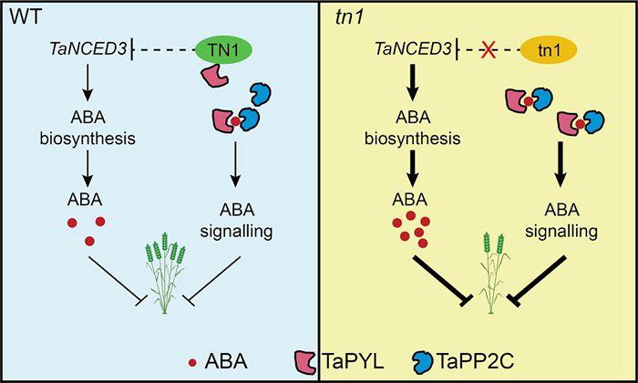 研究人员从突变体库中筛选到一个少分蘖突变体tn1,通过图位克隆方法得到分蘖调控新基因TN1,该基因编码一个含有四个跨膜结构域的锚定蛋白。实验表明,TN1蛋白中一个保守氨基酸的替换突变导致tn1突变体分蘖芽的伸长受到抑制。进一步研究发现,tn1突变体茎基部和分蘖芽中脱落酸含量均显著增加;同时,TN1与脱落酸受体TaPYL存在物理互作,TN1突变后显著增强脱落酸信号转导路径进而抑制分蘖芽的发育。该研究揭示了植物激素脱落酸抑制小麦分蘖发育的分子机制,为小麦株型改良和产量提高提供了新的基因资源和理论支撑。