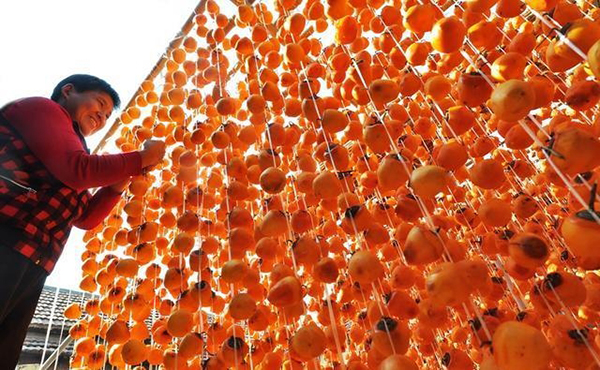 柿子种类繁多,有升底尖柿、辣椒尖柿、珠柿、方柿、四不像柿、重台柿、五花柿、鸡心黄柿、山疙瘩柿、镜面柿、磨盘柿等十多个品种。柿子制成的柿饼 又被称为“合儿饼”,因两个柿脐相对合在一起而得名。“合儿饼”要经过削皮、脱涩、软化、晾晒捏型、出霜等十多道工序精细制作,成品具有个大、霜白、底亮、质润、味香甜五大特色。深秋的陕西富平县曹村镇马家坡村,到处是火红的柿子,家家户户门前房后,一排排排列整齐的柿饼晾晒架非常壮观,一颗颗火红的柿子,如一盏盏小红灯笼,高高挂起笑迎着八方的宾客,给马坡村平添了一道靓丽的风景。红遍的柿子让马坡村成了城里人最爱的秋游地,成了许多摄影爱好者最爱的秋景拍摄地。