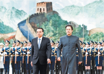 李克强表示,中国和巴基斯坦是好邻居、好朋友、好伙伴,两国传统友谊已深深植入双方人民心中。中巴作为全天候战略合作伙伴,有着高度的政治互信、密切的各领域合作,在涉及彼此核心利益问题上坚定相互支持。习近平主席同总理先生举行会见,就中巴关系友好交换意见。中方始终把巴作为中国外交的优先战略方向。此访期间,双方将发表《加强中巴全天候战略合作伙伴关系,打造新时代更紧密中巴命运共同体》的联合声明,向外界发出双方致力于推动中巴关系更好更快发展的重要信号。