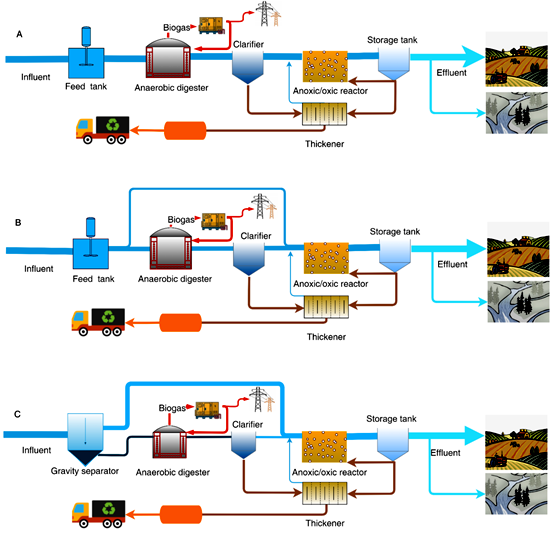 厌氧-好氧组合处理工艺是常用的畜禽粪污处理技术。该研究在前期研发提出的第二代厌氧-好氧组合处理工艺(图B)和第三代厌氧-好氧组合处理工艺(图C)的基础上,建立了能量平衡模型,基于不确定性分析模型,模拟了3代厌氧-好氧组合处理工艺在多种因素影响下实现能量自给的可能性。研究结果表明,环境温度是影响处理系统净产能的主要因素。但是,合理的厌氧消化温度(如20℃)和有机负荷率(最大值的50%)以及提高浓稀分离捕集有机物的效率,可以降低环境温度对净产能的影响。此外,与第一代厌氧-好氧组合处理工艺(图A)和第二代厌氧-好氧组合工艺相比,第三代厌氧-好氧组合工艺显示出更高的能量自给可能性和稳定性,即使在冬天或者寒冷地区,其能量自给可能性也逾80%。