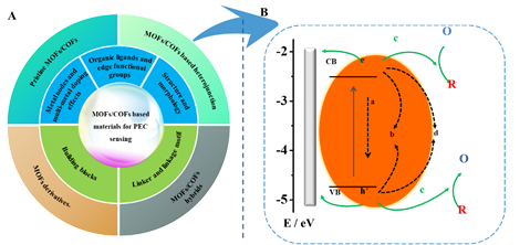 (A)MOF/COF基材料应用于PEC传感的思维导图。(B)电子空穴的产生和转移及可能的复合路径