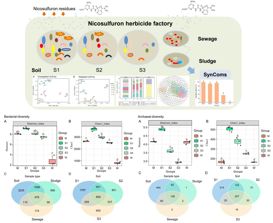 该研究以烟嘧磺隆生产时间超过20年的某企业厂区环境样品为研究对象,利用高通量测序技术,分析烟嘧磺隆长期暴露下土壤、水体和污泥等不同样品中微生物群落结构组成与特征,以及相互作用网络关系。结果显示,样品的分布空间差异、氧含量、pH值和烟嘧磺隆浓度是造成厂区内微生物群落结构差异的主要因素。长期烟嘧磺隆暴露增加了细菌和古菌的α多样性。厂区环境样本中优势类群为拟杆菌门、放线菌门和变形菌门。基于微生物间相互作用关系构建了该厂区环境样本的细菌共发生网络,分离网络中关键节点微生物并构建了烟嘧磺隆降解合成菌群,网络分析与降解评价结果表明,红球菌不仅是烟嘧磺隆长期暴露环境中的关键菌属,还能提高合成菌群的降解效率。