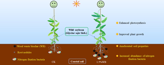 针对黄河三角洲滨海盐碱地盐碱化程度高、土壤透气性差、养分含量低、微生物功能退化等问题,该团队利用当地秸秆、畜禽粪便等废弃生物质资源进行土壤生态修复和实践,建立了生物质炭化还田改良滨海盐碱地的技术体系。通过盆栽试验发现,水热炭化法制备的生物炭比低温热裂解法制备的生物炭在促进盐渍土花生幼苗的生长方面更具优势,其作用机制为提升植物中钾纳比,调节植物激素的生成及分配,重塑土壤根际微生物群落等;通过田间试验,系统研究了滨海盐碱地中土壤微生物对生物炭输入的响应规律,发现生物炭对具有抗逆、促生等功能的微生物丰度有显著提升;此外,发现生物炭影响了土壤中氮循环功能微生物及固氮基因的活性及丰度,促进了黄河三角洲特色豆科植物野大豆的生长,并提升其生物固氮能力。该研究为利用废弃生物质资源进行滨海盐碱地改良和地力提升提供了理论依据和技术支持。