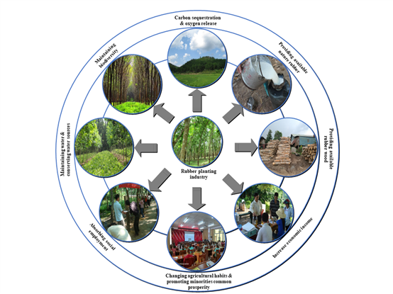 中国热带农业科学院橡胶研究所热带林业生态团队联合南京林业大学开展了橡胶林系统主要功能及驱动力研究,结果表明,橡胶林在七个方面表现出了较佳综合功能。一是储碳固碳功能,我国橡胶林年均碳储量为3700万吨,20年碳储量累积7.7亿吨;吸收二氧化碳年均2000万吨,20年累积吸收二氧化碳年4亿吨。二是释放氧气功能,我国橡胶林年均氧气释放1500万吨,20年累积释放氧气3亿吨。三是维持生物多样性功能,橡胶林间中共发现849种植物、60种鸟类、5种甲虫、25种野生蜜蜂、27种蚂蚁、10种白蚁、87种蜘蛛和38种半翅目动物。四是天然橡胶和木材供给功能,我国橡胶林年均天然橡胶产量68万吨,20年累积生产干胶1400万吨干橡胶。橡胶木材年均128万立方米,20年累积生产橡胶木材2700万立方米。五是涵养水源功能,近20年,我国橡胶林土壤蓄水量年均160亿吨,20年累积土壤蓄水量3500亿吨。六是橡胶种植和种植业经营活动年均吸纳就业人数110万人,20年累积吸纳就业人数2300万人。七是改变农业习惯促进少数民族共同富裕。少数民族聚居区天然橡胶产业的发展不仅彻底改变了“刀耕火种”、“轮作”和“清林”等传统农业做法,还带动了少数民族的科技培训和技术人才的发展,促进了先进科学技术的传播和应用,以及各民族之间的共同繁荣。