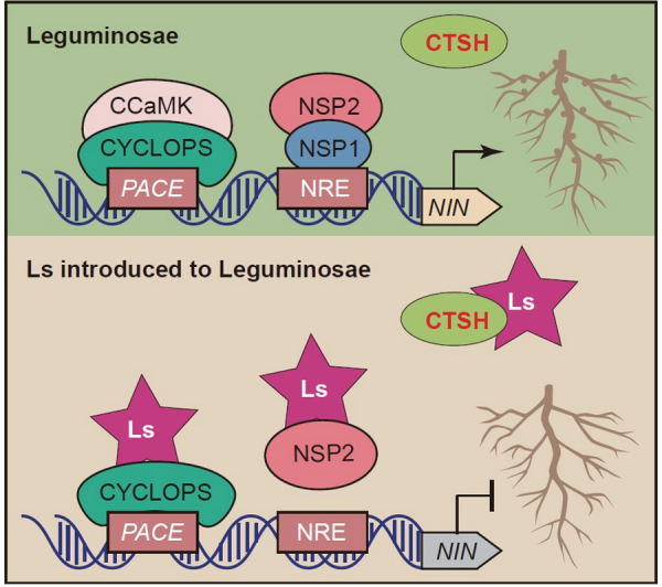 进一步,研究显示, Lateral suppressor ( Ls )在非豆科物种中有同源基因而在豆科物种中没有同源基因,且是豆科丢失的同源基因簇。研究将来自于番茄的 Ls 基因以及来自于水稻的 Ls 的同源基因 MONOCULM 1 ( MOC1 )和 Os7 分别在大豆和蒺藜苜蓿中表达,致使其几乎完全丧失结瘤能力。研究发现, Ls 、 MOC1 和 Os7 可以与NSP2和CYCLOPS互作,降低NSP2/NSP1和CCaMK/CYCLOPS复合体对 NIN 基因的转录激活作用,抑制 NIN 的表达进而抑制豆科植物结瘤。研究表明, Ls 的丢失是豆科植物根瘤共生固氮所必需的。相关成果以 Loss of Lateral suppressor gene is associated with evolution of root nodule symbiosis in Leguminosae 为题,在线发表在《基因组生物学》( Genome Biology )上。